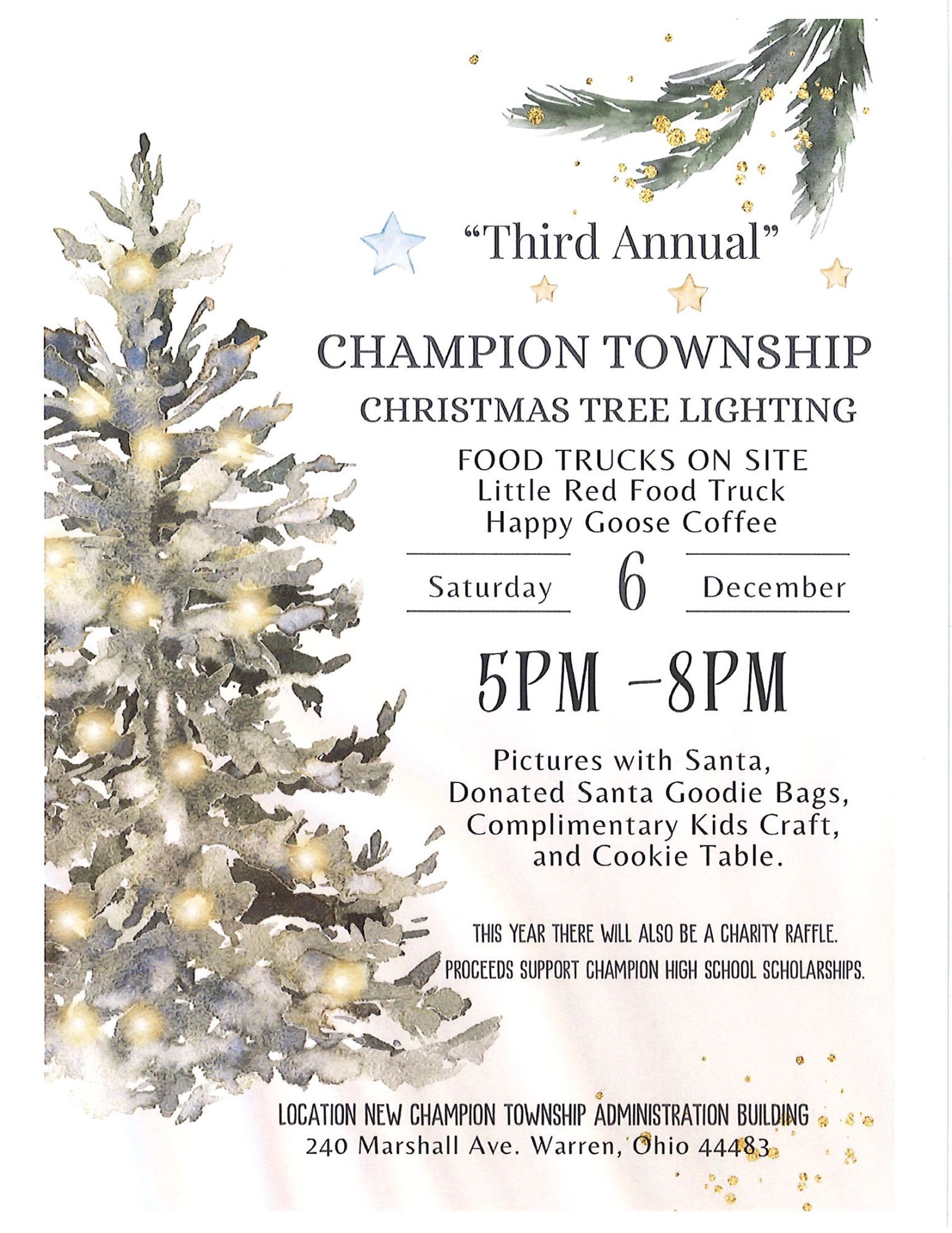 Special Meeting Notice: The Champion Township Trustees will hold a Special Meeting at 6:00 pm on Monday, April 21, 2025, at the Champion Township Administration Building, located at 240 Marshall Avenue, for the purpose of selection of the Health Insurance broker and other general business of the township.